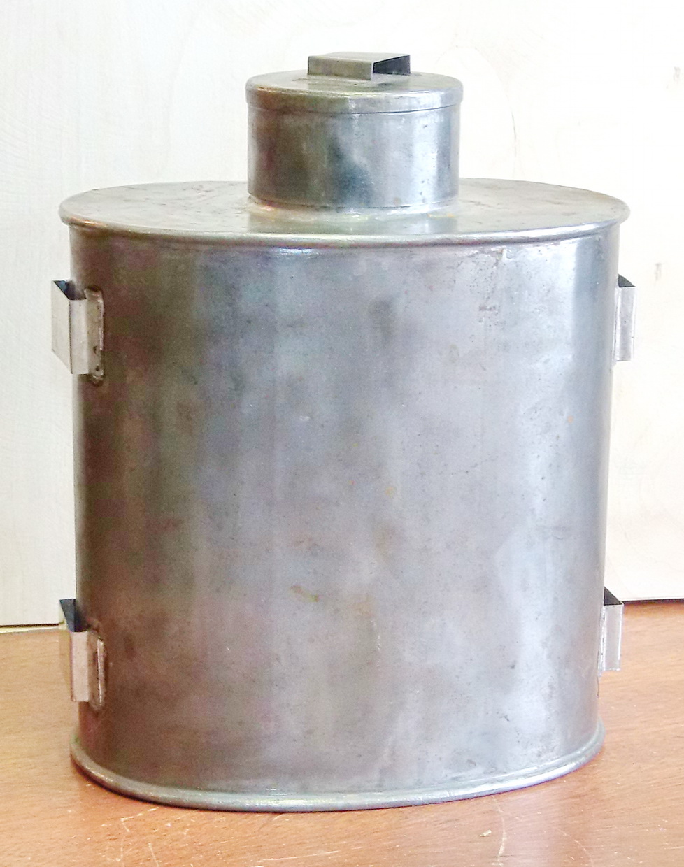 Спасибо, ребят! Погуглил по ссылкам, действительно похоже на оловянную флягу гражданского назначения. Наверное, какой-то паломник носил.