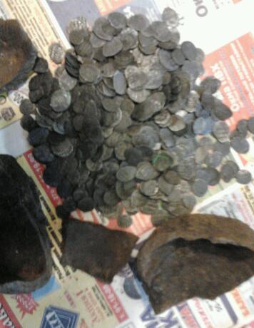 Все происходило на одном урочище. Приехали с дочерью туда. Весь день, в такую жару махали по очереди МД. Естественно в основном я. Ну и копала за двоих. Ближе к вечеру перед окончание поймала слабый неустоичивый сигнал от 28 до 32 стала копать, сигнал скачет во все стороны, то совсем пропадает, потом пошел перегруз, а думаю наверное железо какое, уже зарылась см на 40, только подумала бросить копать, сигнал как взбесился 30, 32. Ну тут я воспряла духом, ручки затряслись и как экскаватор стала рыть, куда усталость девалась. Лопатой разбила горшочек, в самом большом черепке была основная масса чешуи, она слиплась. Все остальное вместе с черепками выгребали с Настей на газету, всю землю выкопанную прозвонили и сквозь пальчики пропустили. Ямку я вырыла не хилую, вглубь более 60 см, и в диаметре с метр. Кладик водил меня. Самое интересное, что именно это место исхожено массой копателей, да и я много раз его прозванивала в другие дни. 585 штук чешуек было. В основном Ивана Грозного, было немного Бориса Федоровича, Алексей Михайлович был, несколько уделов Тверских. На этом урочище 2 года назад нашли клад с серебряными Петровскими рублями. А нашли люди,которые взяли там участок под картошку, стали пахать землю и выпахали. Так они бросили эту землю, и картошка им стала не нужна Сообщение отредактировано СветЛана: Dec 25 2012, 11:41 -------------------- Не думай, что было... Не гадай, что будет... Береги, что есть...
