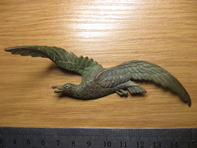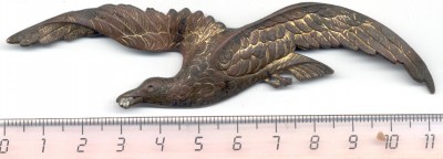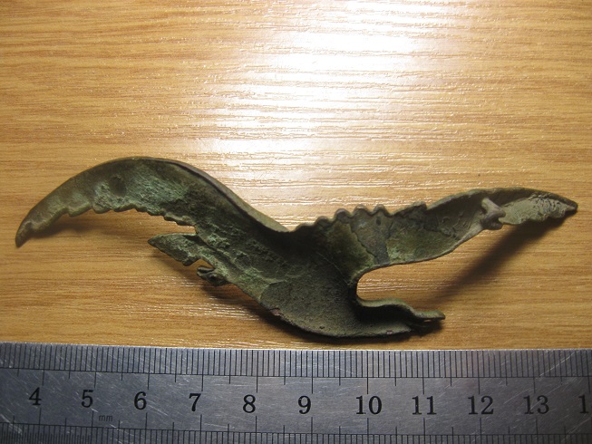 Доброго времени суток. Просьба подсказать- что или от чего может быть? На сувенирку не похоже- больно уж тщательная работа, материал- медь или бронза. На одном крыле видны следы крепления застежки, похоже под булавку, там же просматриваются какие-то буквы. одни нацарапаны, 2 вроде как от клейма, чистить пока не пробовал. Сопутка - монетки, пуговицы Николая2, антанты и до ранних советов. размер, ориентировочно, 8см на 2.5-3см. мерял просто "прокатывая по линейке