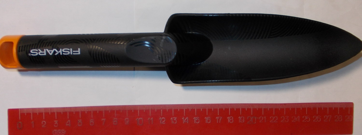 Покупал наши, аналогичные по форме фискарским. Только цена 68 руб была. По прочности с фискарьскими не сравнивал, т.к. фискарьского не имею. На этих совках, в ямке под большой палец, есть значёк "пчёлка". Обычно им комья режу и разбиваю, чтобы меньше руками разрывать и меньше пачкаться.