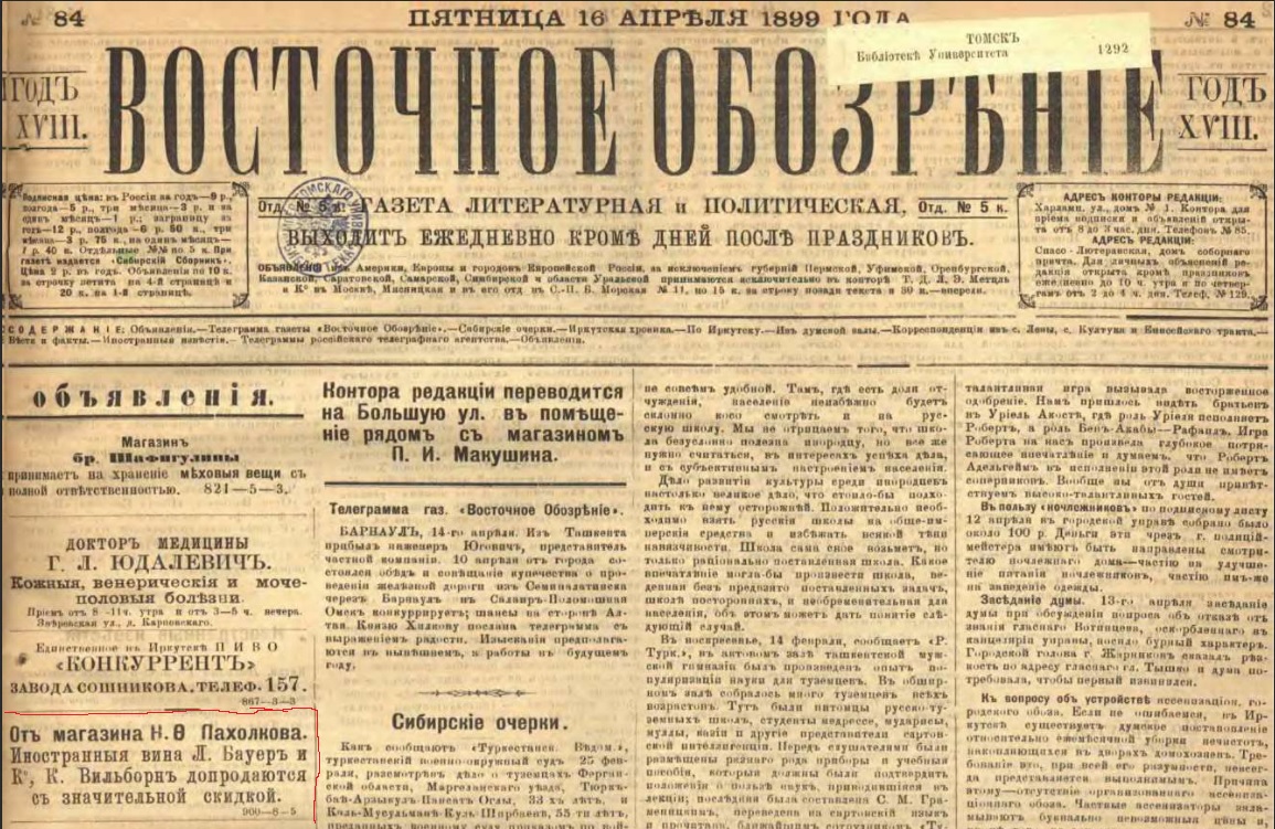 В списке 1-й Гильдии Купцов, Промышленных обществ и товариществ за 1897 год из сборника "Вся Россия. Русская книга промышленности, торговли, сельского хозяйства и администрации. Адрес-календарь Российской Империи, том второй. Издание А.С. Суворина, 1897" есть "ВИЛЬБОРНЪ, Карлъ (вина и сигары), г. Москва, Ильинка, д. Серпуховск. Город. Общества".
