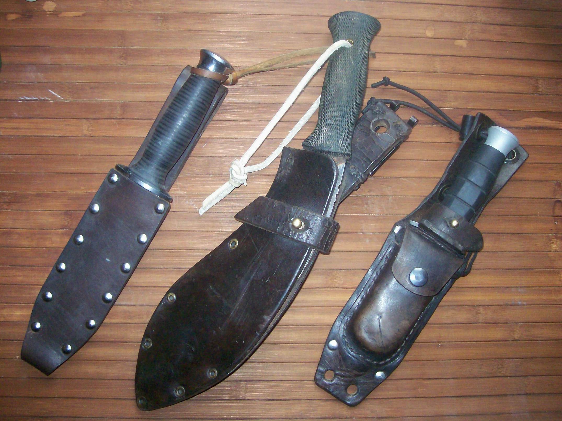 Никому не нужно? Цена договорная. Не космическая. Кожа разная, качественная, толстая. Можно прошить, можно проклепать. Можно прошить и проклепать. На фото ножны "боевые", поюзаные в лесах и полях. Живучие.