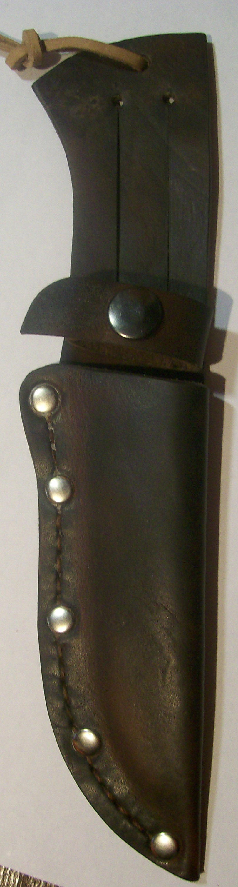 QUOTE(Azazello @ Mar 13 2012, 16:09) Если среднего размера, простецкие, без изысков, на клепках -300-400 руб. Прошивка- чуть подороже будет. Но, при наличие клепок- не нужна прошивка. Тлько для декора. Шью руками, ибо чепрак толстый. Накладные кармашки- еще чуть дороже, ибо нужно кожу формовать и тянуть. Подвес обговаривается. Мне нравятся быстросъемные и с возможностью горизонтального и внизголовой подвеса. Шью, потому как нравится работать с кожей и есть свободное время. Зарабатывать не сильно получится на этом)) При желании заказать- не лень будет порисовать и отослать "чертеж" для согласования. Или по вашему рисунку забацаю. Ножны что на фото- делались год-два назад и активно использовались. Потому и вид потасканый. У кхурхи- лет 8 ножнам. От вас нужно скан или фото ножа с линейкой для масштаба и указание толщины. По форме ножа изготавливается "рыба" по которой далее все делается. Ценник, практически, шоколадный... Дешевле - только самому шить... -------------------- Одна голова - хорошо... две - лучше... а три - мы не прокормим...