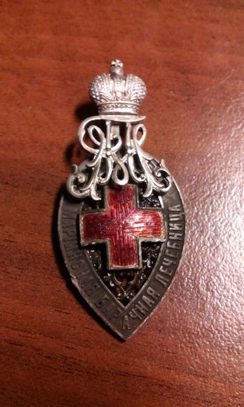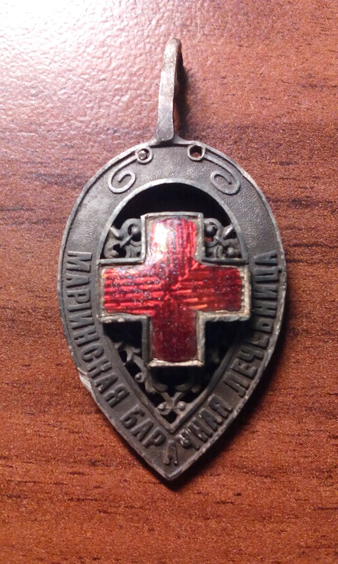 Жетон Третьего Санкт-Петербургского дамского комитета Великой Княгини Марии Павловны Российского общества Красного Креста в пользу Мариинской барачной лечебницы. На оборотной стороне жетона гравировка: «1904 И. К. Воронову». Неизвестная мастерская, Санкт-Петербург, 1904 г. Серебро, эмаль. Размер 49х23 мм. Вес 13,92 гр. Клейма на ушке: пробирное “84” с женской головкой влево и инициалы пробирного инспектора Я. Ляпунова и мастера неразборчиво. Состояние XF. Грибанов# 66.