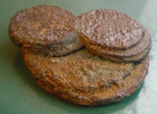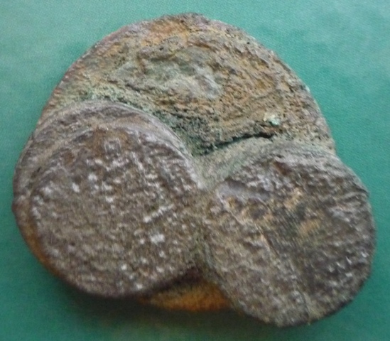 Похоже они в известковом налёте, в ручье вроде лежали или рядом в влагой.Зачем закапывать? Надо разъединить. Я бы попробовал нагрев на газу до появления зелёного пламени, ни секунды дольше! А потом в холодную воду. Если надо, то повторить. Гидроудар должен отбить шлам и монета не перегреется. О результате отчет ждём!