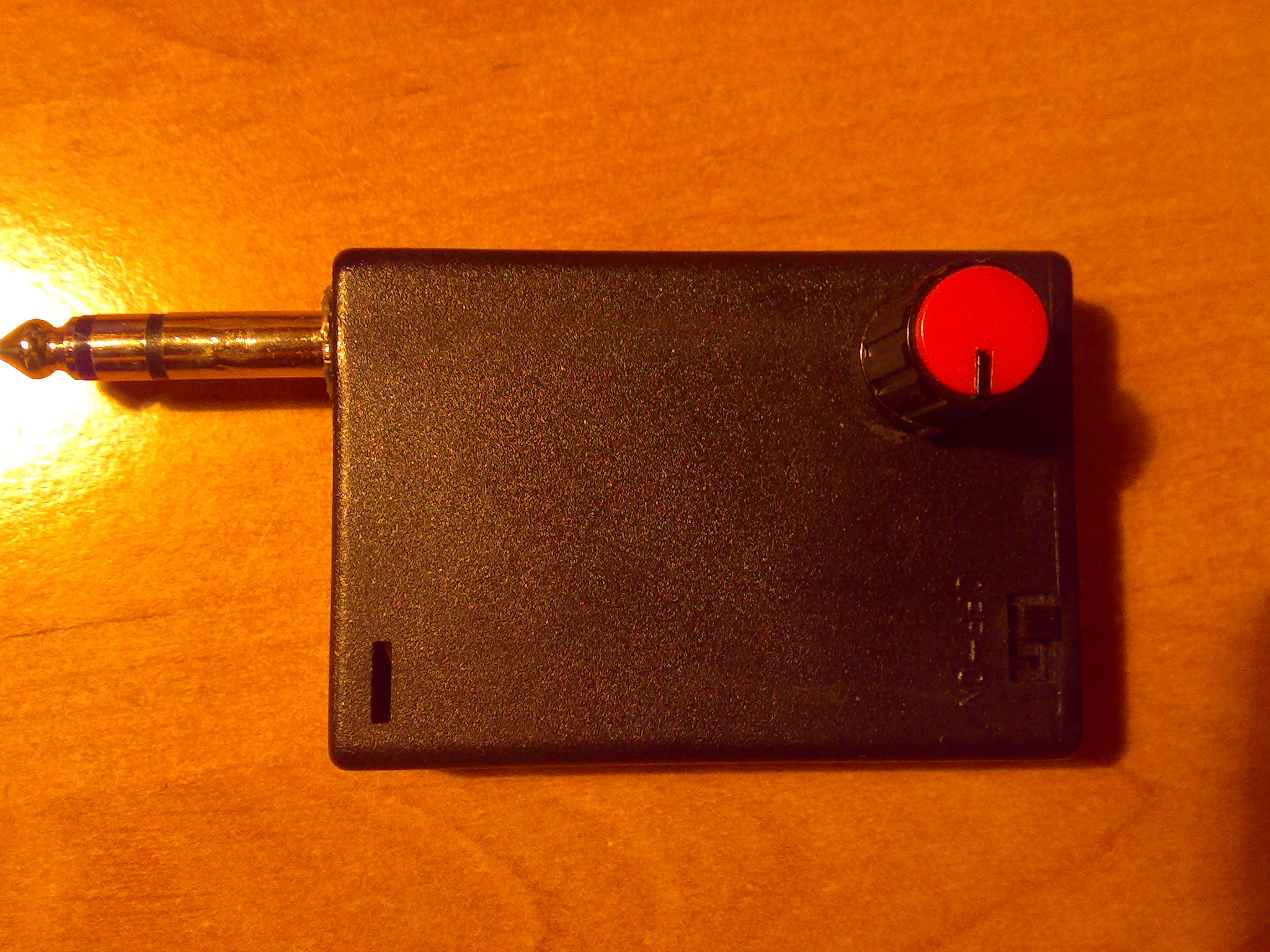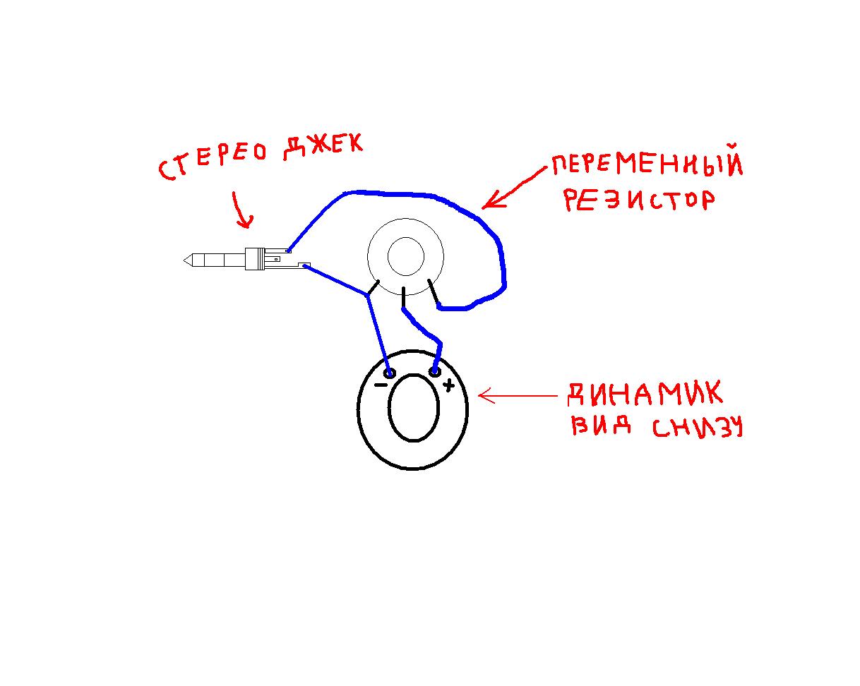 Себестоимость такого девайса около 150 рублей, все необходимые детали можно приобрести в любом радио магазине или на радиорынке. Итак вам понадобится:Стерео джек штекер 6,5мм, динамик любой малогабаритный сопротивлением от 8 до 32 ом(можно выковырять с любой китайской игрушки или купить в магазине, стоит около 30р.),переменный резистор любой можно использовать от 1 до 10 кило ом(возможно применение и других) и собственно коробка куда это всё запихнуть, я использовал бокс на 3 пальчиковых батарейки, но можно и другую подходящую коробочку. Выкладываю собственно схему устройства: Вложенные эскизы изображений |
