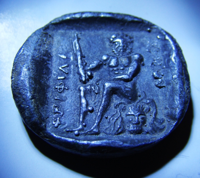 Это Древняя Греция Фракия. Абдеры (c.411/10-386/5 до н.э.), Серебряный статер, 12.83g. ABΔH, грифон сидящий влево, крылья слегка расставленными, цикада слева. EΠIΦIΛA / ΔOΣ, Геракл сидит три четверти налево на скале задрапированой львиной шкурой. -------------------- Scio mе nihil scire