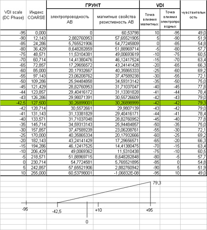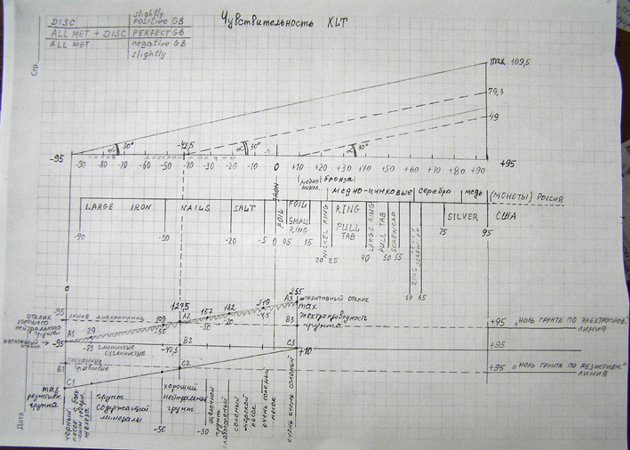 Здесь я представил графическое изображение взаимосвязи чувствительности и показателей грунта. С первого взгляда картинка может показаться сложной, однако на самом деле все очень взаимоувязано. Вверху расположен график чувствительности, а внизу график грунтов. Эти графики взаимосвязаны вертикальными линиями, идущими из точек -95; -42,5; +10. Под верхним графиком расположена линия чисел VDI с надписями целей (скопированная с ХЛТ). Как известно, чем выше электропроводность металла, тем выше его отклик, и соответственно прибор найдет его глубже при прочих равных условиях. Вверху линии чисел условно обозначены диапазоны Российских монет. Существует хороший грунт, еще его называют нейтральным грунтом. Его точка на обеих графиках «-42,5». Влево и вправо от этой точки свойства грунта начинают ухудшаться. Другими словами, грунт начинает мешать поиску. Точка «-42,5» в ХЛТ соответствует индексу грунта COARSE = 127,5. Соответственно точка «-95» соответствует 0, и «+10» соответствует 255. Посмотрите на график грунтов. Линия точек А1, А2, А3 отображает электропроводность грунта, в точке А3 грунт имеет максимальную электропроводность. Линия точек С1, С2, С3 отображает магнитные свойства грунта, причем в точке С1 расположен максимальный показатель. Значения обеих факторов грунта расположены по обе стороны горизонтальной прямой А1-В2-С3. Внизу графика грунта условно подписаны названия грунтов, соответствующие определенным числам грунта. Когда ХЛТ производит автоматическую балансировку по грунту, он прописывает индекс грунта в настройках COARSE. Зная это число можно определить начальную платформу настроек прибора. Вся проблема настройки состоит в отыскании таких оптимальных значений параметров, при которых чувствительность прибора была бы максимальной, но при этом сохранялась стабильность работы прибора. При балансировке по грунту, прибор учитывает не только отклик грунта, но и параметры настроек. Прибор учитывает превалирующее свойство грунта, и соответственно ему настраивает порог. И электропроводность грунта либо его резистивность (магнитное свойство) уменьшают глубину поиска целей. Максимальная чувствительность ХЛТ (канал дискриминации) может быть достигнута на грунте COARSE = 127,5 при приеме диапазона от -42 до +95, чувствительность при этом составит 79,3 единицы. Предельная минимальная чувствительность ХЛТ (канал дискриминации) составит 49 единиц, при приеме диапазона от +10 до +95 , при работе на грунтах COARSE = 0, COARSE = 255. Вывод: каждому грунту должен соответствовать свой диапазон приема чисел VDI, и зная число грунта, можно узнать число начала диапазона. Итак, начинаем настраивать ХЛТ: Цель настройки: увеличение чувствительности (глубины поиска). В ходе настройки будут определены: диапазон приема чисел VDI, АС, DC, PG, Transmit Boost, необходимость приема числа +95. Запускаем программу «Реликвии». Выполняем балансировку по воздуху и грунту. После проведения балансировки смотрим значение COARSE в G.E.B. В предполагаемом районе поисков следует сделать три – четыре замера в разных точках площадки. Записываем значения и выключаем прибор. Если значения сильно различаются, тогда вычисляем среднее значение (складываем все значения и делим на количество замеров). В таблице находим в столбце COARSE близкое значение. Например, я получил значение 32, это значение ближе к значению 36,429. В столбце «ГРУ