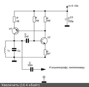 Собрал автогенератор по схеме Вайтса. Запитал 9 вольт - типа "Крона". В контуре ёмкость 10 наноФарад
