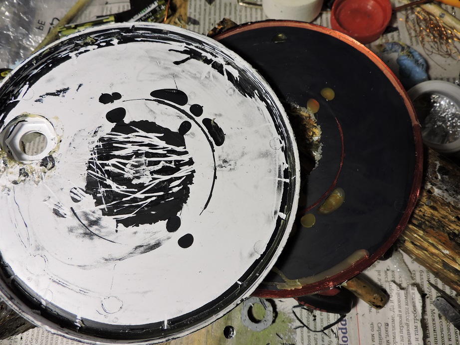 В верхнюю крышку обмотки были вклеены на эпоксидку, поверх старого экрана. Я так же уложил эти обмотки в крышку, на разведенную эпоксидку. Нижняя крышка приклеивается дихлорэтаном, как и было. Катушка собрана так же как и была. Все осталось по прежнему, заменен только экран. |