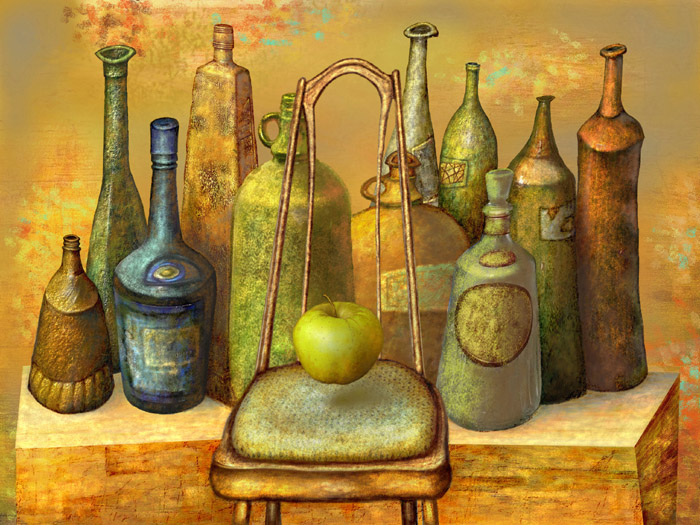 QUOTE(Пушкарь @ Mar 24 2015, 12:31) Поддерживаю. Но с распросами не отстану - бутылки с яблоком классные. Их как творили? Вы этим занимаетесь, что детали интересуют? Фон сделал из нескольких текстур. Соорудил стол тоже из текстур методом стыковки и искажения. Бутылки взял из своей коллекции, сфотал исказил и наложил отдельно на каждую текстуру, мышкой подрисовал этикетки. Сфотал старый стул, исказил и тоже подрисовывал мышкой и с накладыванием текстур, а также проходился всякими кистями, для придания фактуры. Яблоко подвесил и нарисовал тень от него на стуле. Кстати сейчас смотрю - тень плоховато получилась.))) И другие ошибки вижу. Но переделывать уже не буду. Пройденный этап творчества ))) Сообщение отредактировано alexsulim: Mar 24 2015, 14:08 -------------------- Ушёл в себя и заблудился...