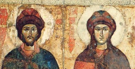 Привожу фрагмент иконы 13 в. "Борис и Глеб". На ней, да и на остальных, Борис изображается с небольшой бородкой, а Глеб - без оной с длинными волосами. Скажите, мне, видимо, только одному кажется, что на иконе ТС изображен Борис? После мнения таких авторитетов мои слова покажутся странными...