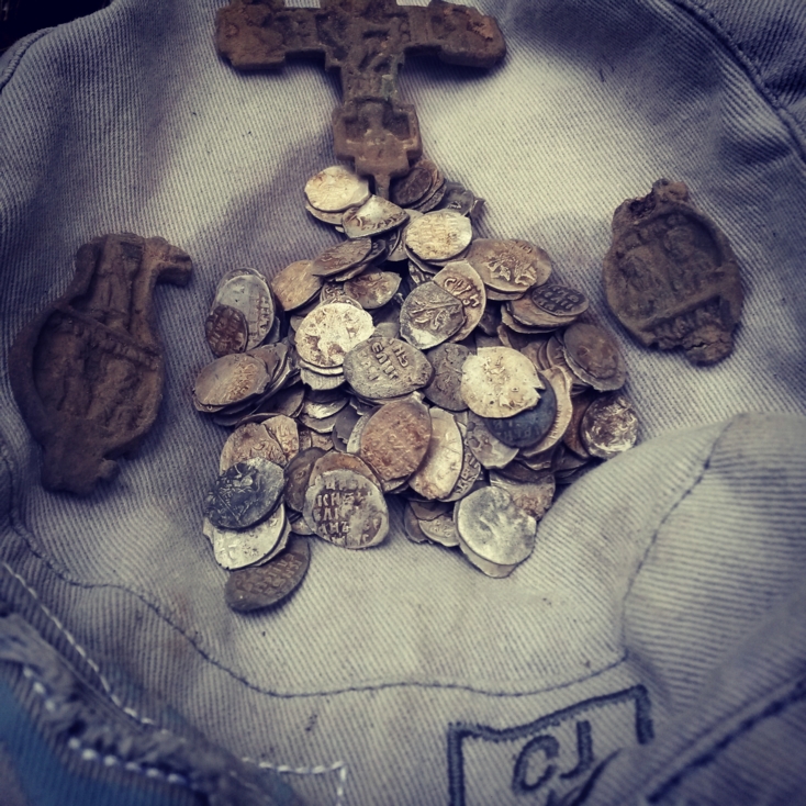 Опустошив фляжку в прекраснейшем настроении пошли шурфить линию на которой попадались монетки. Нашли примерно столько же, сколько было в ядре! Общий итог 222 шт! Может и не клад это, а кошель, но для нас ЭТО КЛАД!!! Вложенные эскизы изображений |
