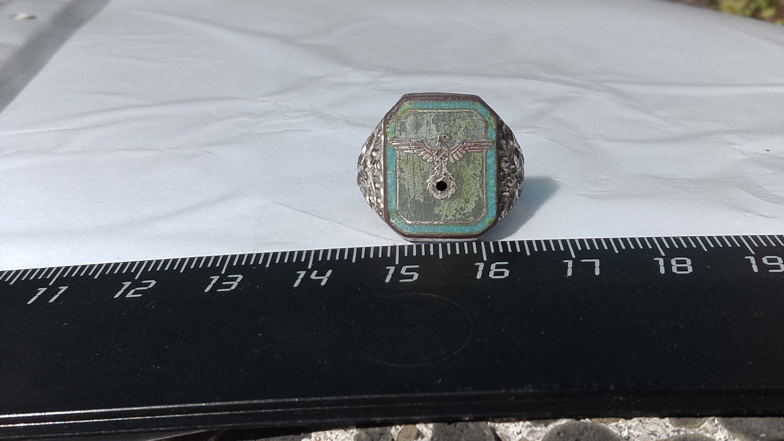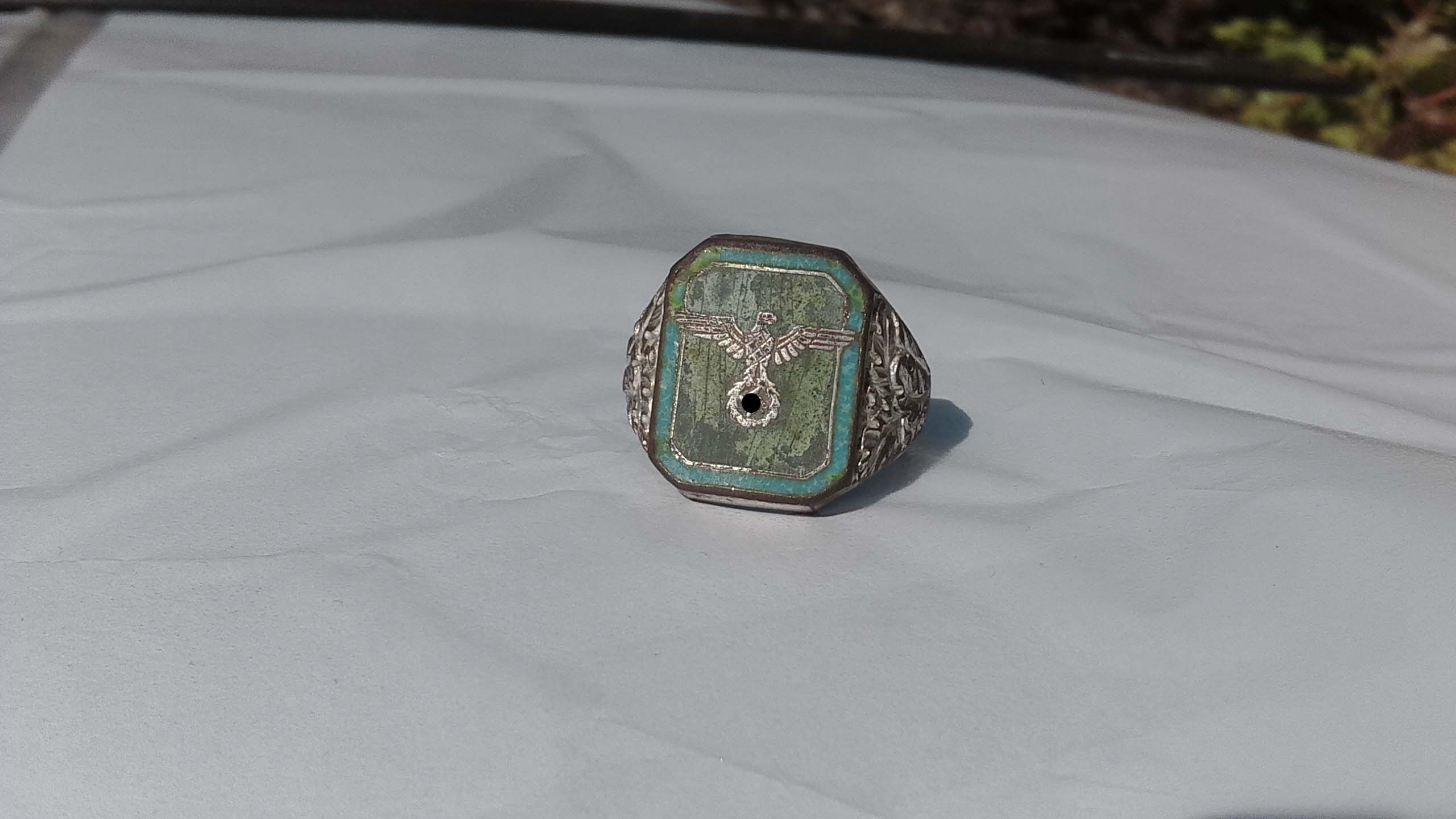 Доброго дня еще раз! Позавчера при проведении земляных работ),в тьмутараканьей ленинградских болот, на поверхность извлекся немецкий перстень. Изображение орла на свастике находятся на каком-то сине-зеленом материале, типо яшмы или хз точно. Перстень медный походу с позолотой, изображение орла и свастики, видимо из золота, потому как абсолютно не окислилось. Проб и надписей никаких нет. Камрады подскажите, кто мог из гансов (род войск и тп ) юзать перстенек, и стоит ли он чего у коллекционеров? Спасибо, с уважением!