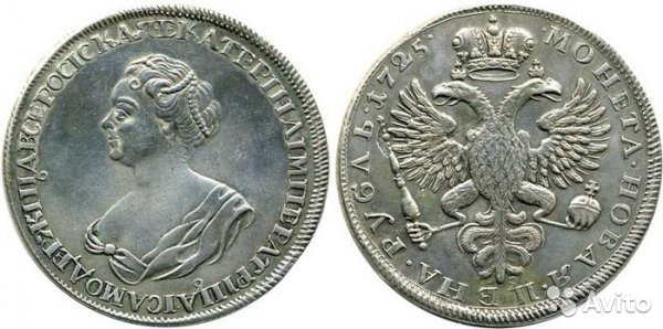 На авито выставлена такая монета. Что это? Вид товара: Монеты На лицевой стороне монеты портрет развернут влево, в волосах императрицы небольшая брошь и нитка жемчуга, надпись - ЕКАТЕРIНА IМПЕРАТРIЦА I САМОДЕРЖIЦА ВСЕРОСIСКА. На обратной стороне двуглавый орел, надпись - МОНЕТА НОВАЯ ЦЕНА РУБЛЬ 1725. Диаметр 41 мм. Вес 28,44г. Металл - серебро 70 пробы. Гурт - шнур. Номинал - один рубль. Считается редкой, так как выпуск длился всего две недели. Стоимость варьируется от $3.000 до $40.000. Вложенные эскизы изображений -------------------- Бывший ник Ирек. ( 87 кг репы) слетел!(((