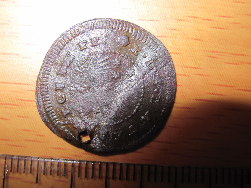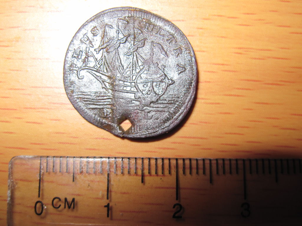 Вряд ли эта бирка - монета. Хотя..., может быть. Скорей всего это испанский корабельный жетон. Период - 17-18 века. Дырка в жетоне сделана вручную - гвоздем. Четырех-гранное отверстие этому подтверждение. Как этот жетон использовался - как бирка, жетон или пломба какая-то - можна только гадать. Есть у меня версия: эта надпись на испанском: Plus ultra - перевод. на русский - Еще дальше; вперед. Корабли испанцев в 15-17 вв. плавали тогда по всем морям и океанам, захватывая все новые и новые територии. Отсюда и девиз: плыть все дальше и только вперед. Карта испанских колоний в 15-18 вв.