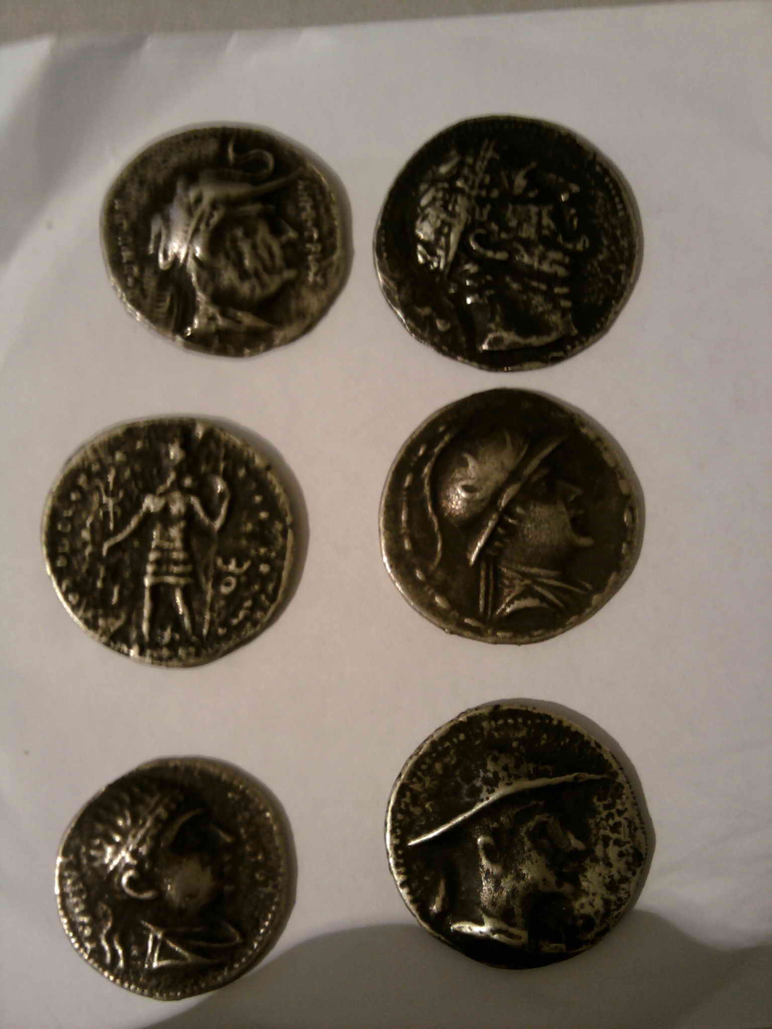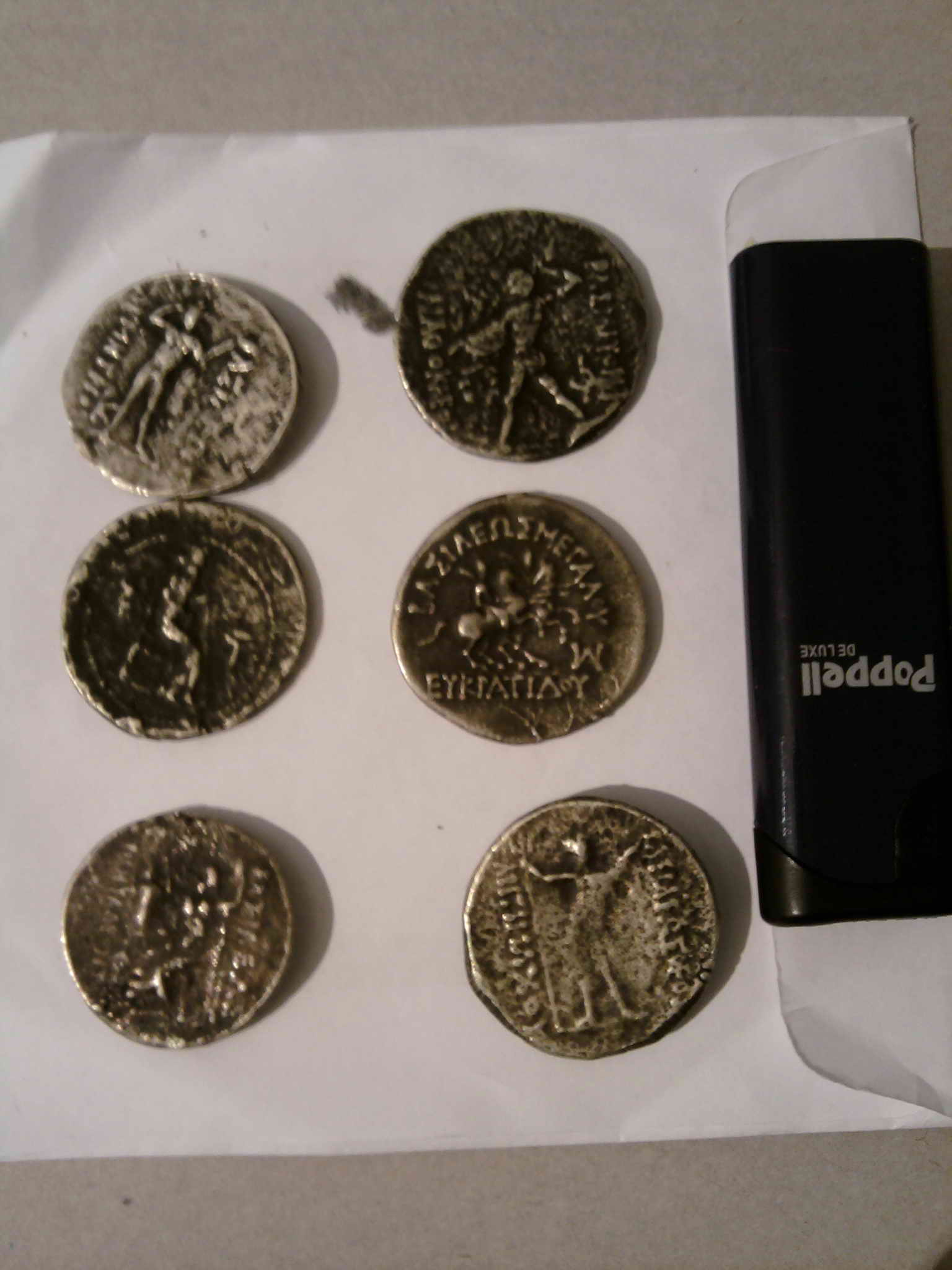 Вроде бы Греко-Бактрийские тетрадрахмы, но фото плохие и утверждать по ним, фуфло или же подлинные - сложно. Нет веса, масштаб примерный...