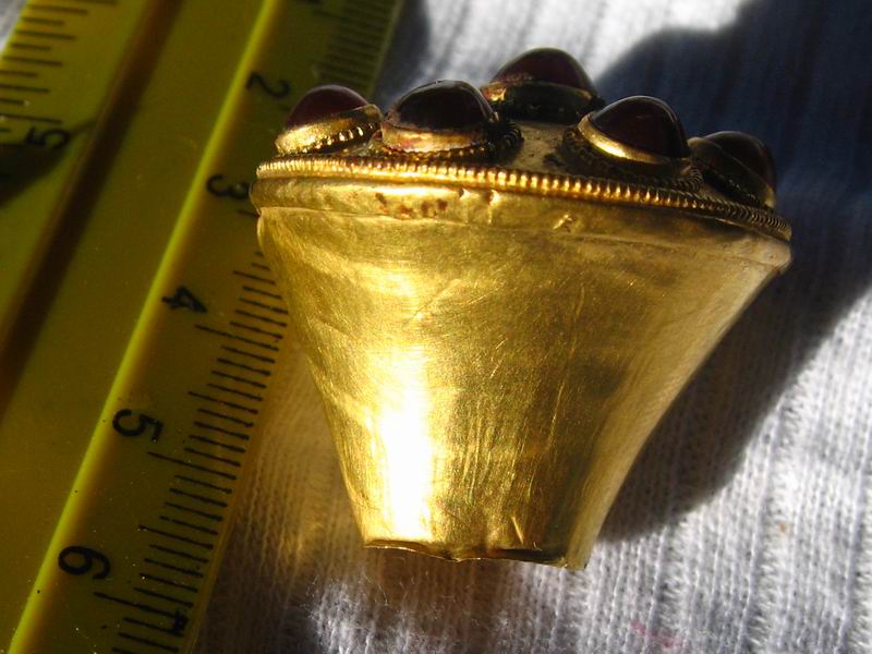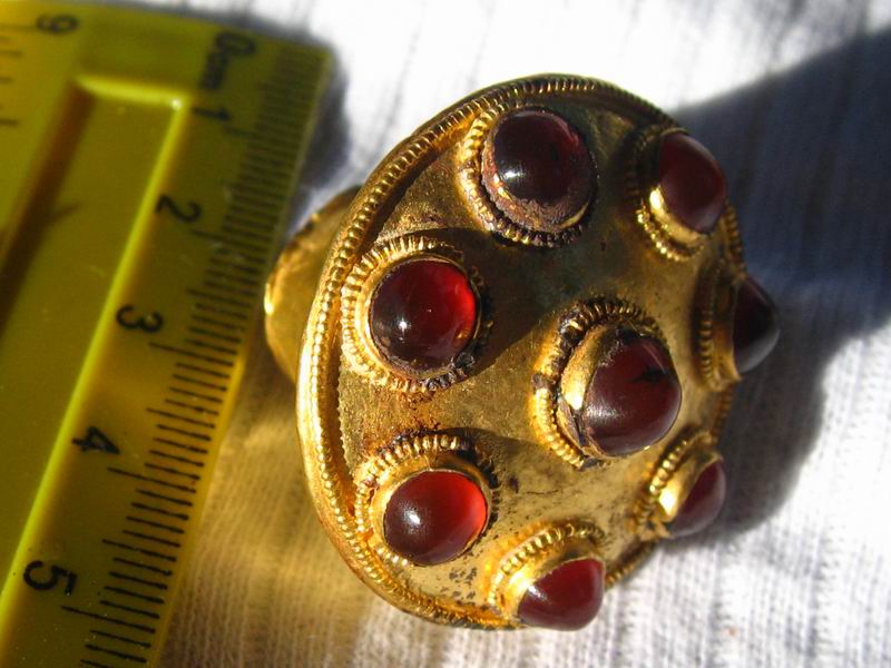 http://www.ancienttouch.com/160.jpg ROMAN GOLD RING IV c. A.D. Round hoop consisting of three wires soldered to the flat strip; two spirally twisted wires, with one round wire between them. Garnet cabochon set in round box-type shield with thick beaded wire band. The hoop and shield were made separately and soldered together. Half of the twisted wire on one side is lost. 18 x 24 mm. -------------------- я ничего не продаю, карты нет!!! Если вам пишут от моего имени это мошенники...