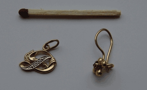 Провёл воздушные тесты по "пляжному золоту" - нашёл у жены небольшие золотые фиговинки и поработал над ними катушкой 5"DD, как у Фишер Голд БагII. Цели - маленькая золотая буковка "Д" весом 1,13г и серёжка - малюсенький золотой "цветочек" с каким-то камушком весом 0,61г.