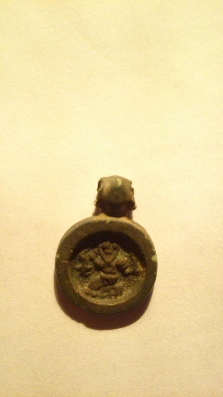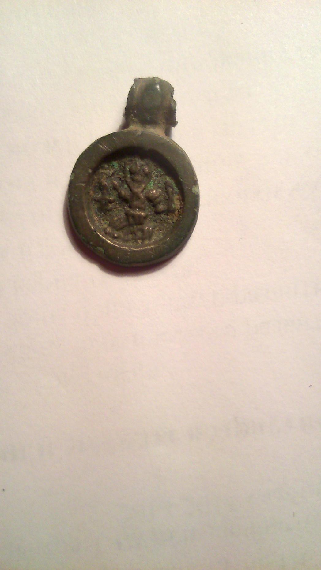 Великомученник Никита, побивающий беса. 15в. Надпись "МИКИТА". Аналоги опубликованы в книге А.К. Станюковича "Неизвестные памятники Русской металлопластики. Миниатюрные иконки-привески XI-XVIвв." С.74, №282-284.