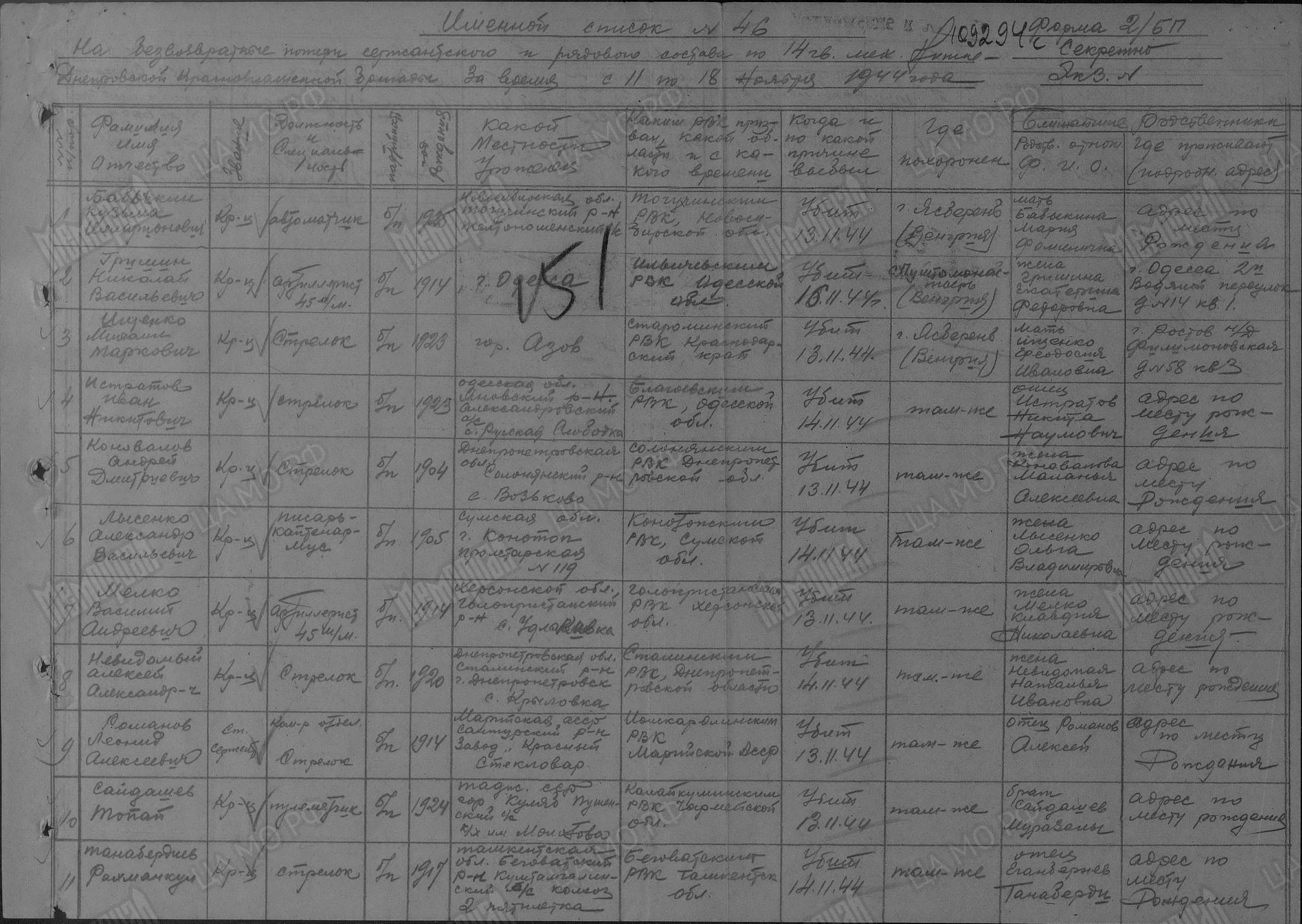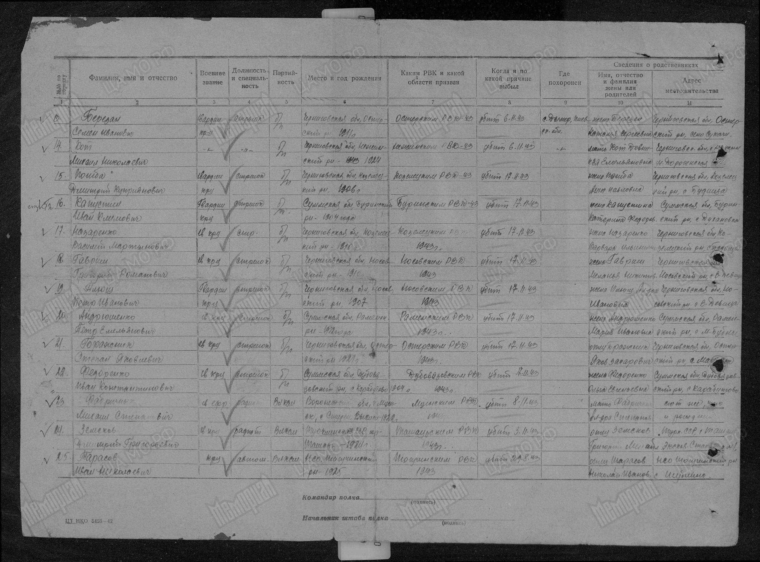 Зенков Иосиф Федорович Дата рождения/Возраст __.__.1919 Место рождения: Чкаловская обл., Пономаревский р-н, с. Кирсаново Дата и место призыва: Пономаревский РВК, Чкаловская обл., Пономаревский р-н Последнее место службы: 54 полк ОЖДС Воинское звание: красноармеец Причина выбытия: пропал без вести Дата выбытия: 23.08.1941 Место выбытия: Калининская обл., Ржевский р-н, Чертолинский с/с, Чертолинск, 85 км Мой дед: Зенков Иван Федорович, танкист, пришел с войны без ноги. -------------------- ex RA4PTP, UA9JKI