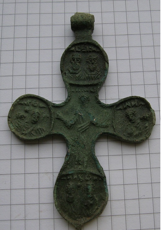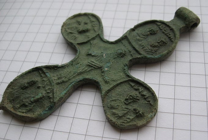 Предметы были найдены в одном районе, но в разных местах. крест чистить специально не стал. Есть печальный опыт, когда от вещи остаётся медяшка с рельефом. Да и прочитал про мнение, что некоторые вещи лучше спецсредствами не чистить, короче без фанатизма. Поэтому оставил, как есть.
