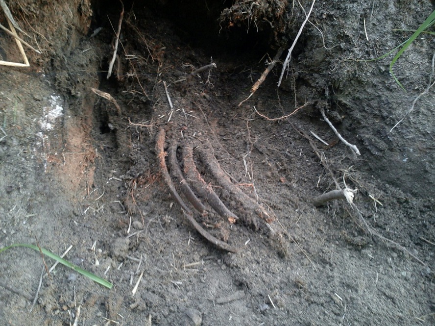 Начало подъема первым найденного бойца! Из-за сильно разросшейся корневой системы ели, подъем бойца под "кисточку" был не реален, но других мы постарались именно так и поднять, с фиксированием останков в том положении в котором они погибли, практически у всех были пулевые ранения, и только у одного, еще в то далекое время исчезло лицо.