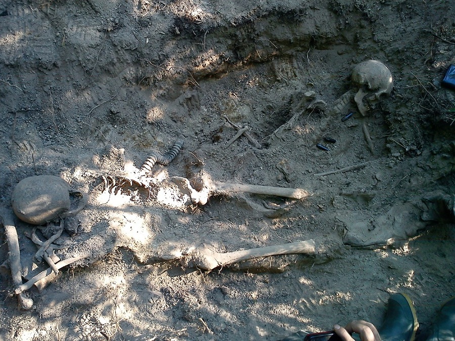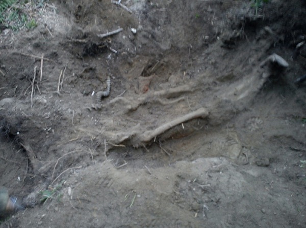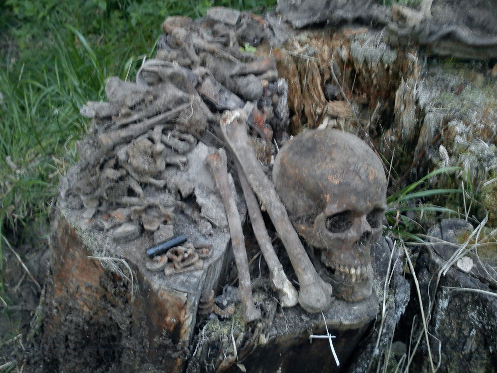 Останки бойца, находились сразу под мхом, слегка занесенные лесным слоем семидесяти летней давности(бойцы были в шинелях и скорее всего осень 1941 года)