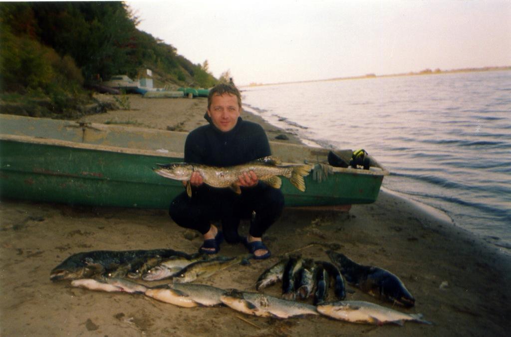 Мы познакомились с ним неожиданно… Зимой 2005 в городской газете я увидел объявление: «Продаю кассету «Великая Ра». Звоню и предлагаю обменять на «Судаков» Лагутина. Встретились, познакомились, обменялись дисками и номерами телефонов. С тех пор Андрей в моём мобильнике именуется «Великая Ра», да и в охотничьих кругах Воронежа за ним держится это погоняло. В день приезда мы ныряли в акватории пос. Генеральское, но ничего интересного не обнаружили. Оба настреляли по несколько щук, самая крупная на 2 кг. Переехали ближе к основному руслу Волги, в посёлок Шумейка, где базировались спортсмены на подводных соревнованиях. Даже пейзажи были те же, всё как в фильме «Большое подводное приключение». Весь второй день поездки мы провели в воде. Интересным объектом оказалась затопленная баржа. На поверхности хозяйничала многочисленная стая голавлей, ловивших плавающих рыб-иголок. Рыба-игла очень внешне похожа на морского конька и обитает в здешних местах в больших количествах. Залезая в квадратные люки я ожидал увидеть крупного сома, а Андрей-трофейного судака. Но кроме мелкого полосатого окунька здесь никто не проживал. Тёмное пространство железного трюма сильно давит на психику, появляется подводная клаустрофобия, чего на суше никогда не было ни у меня, ни у Андрея. Неосторожный взмах ластами и легковесный ил распыляется везде, сразу же теряешь ориентацию и не знаешь куда плыть. В таких ситуациях я выклюсал фонарь и искал вверху просвет квадратного выхода. Ощущение , скажу честно, не из приятных. Сказать что мы были немного разочарованы, значит ничего не сказать. Местный тракторист, огромного роста, в ярко-оранжевом комбинезоне, весь загорелый как африканец, с толстой золотой цепью на шее долго над нами смеялся!? Он целый день загружал своим импортным трактором песок в новенькие «Интернейшеналы» и «Маны» и наблюдал за нами. - Что вы здесь ищите? Здесь же нет ничего- поднимал он нас на смех, перебирая нашу скромную добычу. Мимо нашей палатки проехал УАЗик, нарушая утреннюю тишину и разрывая в клочья остатки былого сна. До рассвета ещё около часа, но рыбаки уже съезжались. Мужчина в возрасте, что нас наглым образом разбудил, с радостью поведал несколько историй. Его рассказ подтверждал информацю собранную нами ранее. Это обстоятельство несказанно радовало и Андрея и меня, а также вселяло неистребимую уверенность в успехе нашего совместного подводного проекта. Привязали лодку к толстому корню и ушли под воду. Договорились периодически поднимать голову и обнаруживать друг друга, чтобы не потеряться на этой огромной акватории. Первый трофей в этот день взял Андрей. Слышу шумит, смотрю по сторонам и вижу как он в далеке держит над головой хорошую рыбу. То, что я увидел потом, повергло меня в состояние шока! Я попал на небольшую полянку, где притаилась огромная стая язей и окуней. Поражали размеры рыб! Язей по 2-3 кг я видел и стрелял, но чтобы окуни были таких же габаритов-такого мне ещё не доводилось наблюдать. Моё появление посеяло панику в стае, рыбы метались из стороны в сторону, ошарашенно водил ружьём и не успел сделать выстрел. Огромные полосатые разбойники и серебристые красавцы попрятались. После этого я искал их около часа, но не обнаружил никого. Андрея не было видно, и я поплыл в его сторону, выше по течению. Встречал ещё нескольких судаков, 