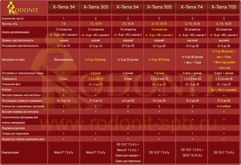 X-Terra 305 ![]() вторая X-Terra 505 ![]() и третья X-Terra 705 ![]() Модель 705 серии теперь могут сразу комплектоваться 10,5 дюймовыми DD катушками с рабочей частотой 7.5 кГц Изменения коснулись так же и внешнего вида, измелась и цветовая гамма девайсов, прибавилось частот, функций и в некотором роде возможностей..... например 305 модель, эквивалентная 34 терре, теперь имеет 2 рабочих частоты... 7,5 кГц и 18,75 кГц, соответственно теперь поисковых катушек больше )), так же как и у всех моделей расширен диапазон настроек... 505 терра, эквивалентна 54, теперь работает на 3-х частотах, это 3 кГц, 7,5 кГц и 18,75 кГц, так же увеличено количество сегментов дискриминатора, количество звуковых тонов и т.д. Таблица совместимости катушек новых девайсов... ![]() Всеяредакция ревьюдетектора планирует провести полный обзор каждой машины, новой линейки X-Terra, и порадовать наших пользователей полным и развёрнутым, как текстовым обзором, так и видеорецензией. -------------------- Хорошо там, где нас нет.