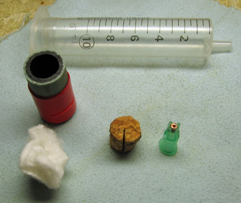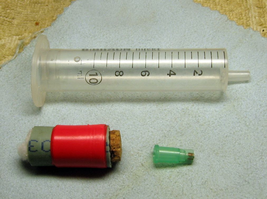 Основа - шприц одноразка 10-ти кубовый. Также пригодится обрезок толстостенного резинового шланга, подходящего калибра (от шланга стиралки). Отрезаем кусок шланга длинной 3 см, один конец затыкаем пробкой с разрезом (до половины), она играет роль тормоза-натяжителя проволоки. Я вырезал из корковой пробки. Резина не сильно подходит, трение большое, проволока идёт туже, чем с корковой. Свободный конец трубки набиваем ватой, пропитанной спиртом, или используем войлок (у меня провод был в какой-то присыпке, очищает отлично). В самам шприце, у верхнего края, сверлим отверстие, диаметром 1мм, для доступа воздуха. По поводу насадки-фильеры. Берём родную иглу от одноразки, греем паяльником саму иглу и снимаем пластик с иглы. Для фильеры отлично подходит кусок трубки-капиляра от холодильника. Отрезаем кусочек, длинной 1 см, зажимаем в тисках. Затем тонким сверлом аккуратно рассверливаем внутреннее оверстие до нужного диаметра, на глубину 2-3мм. Для проволоки давметром 0.5 мм я сделал отверстие 1.0 мм. Отлично подошло. Затем отрезаем просверленный кусок, длинной 2мм. В пластике от иглы разсверливаем отверстие под фильеру (в моём случае, диаметром 2мм), вставляем фильеру и слегка прогреваем паяльником (что-бы вплавилась в пластик). Всё, пользуемся. Фильеру из металла можно и не делать, но тогда проволока быстро разобъёт пластик и слой смолы на проволоке будет очень толстым. Для одной обмотки Tx (30 витков проводом 0.5мм размеры обмотки катушки из темы "как я фишер делал") у меня ушло ~ 6 "кубиков" смолы. При работе очень удобно. Руки не пачкаются, можно уложить провод так, как нужно. |