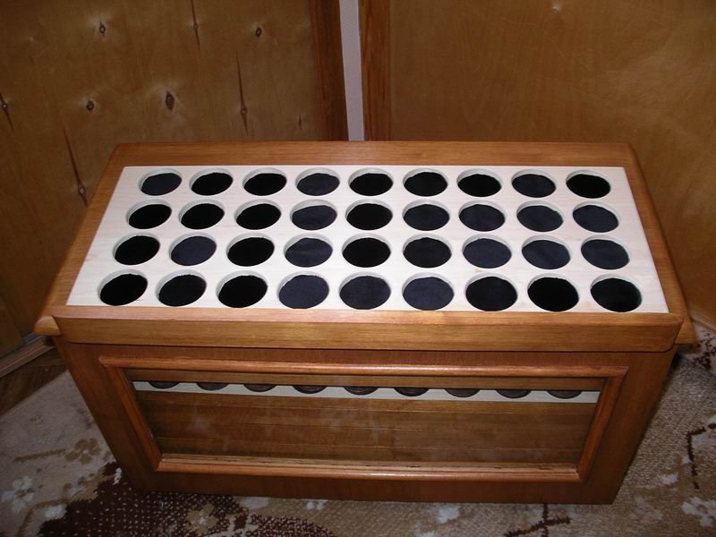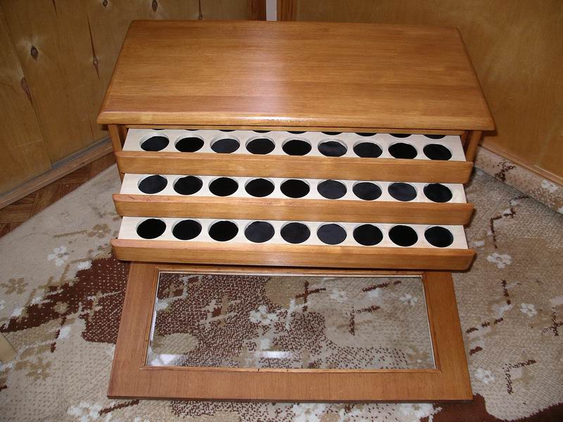 Материал-мебельный щит из берёзы. Из "химии"- морилка на водной основе, и столярный клей. Лаком не пользовался. Наносился слой морилки, поверхность шкурилась и так несколько раз. Отверстия под монеты 50мм в диаметре и 7мм глубиной, туда кладётся кружок бархата. Выставляю на ваш суд, если у кого есть опыт изготовления подобных изделий-просьба делиться опытом. |