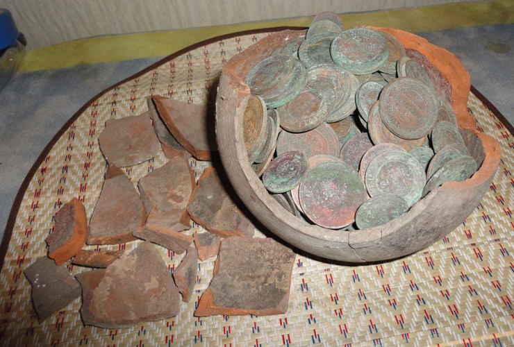 была такая традиция в деревнях собирать все на медь,наперсток поэтому с монетами и положили.так кк монеты к моменту их припрятывания уже ничего не стоили только как медь,тоже самое и с серебром