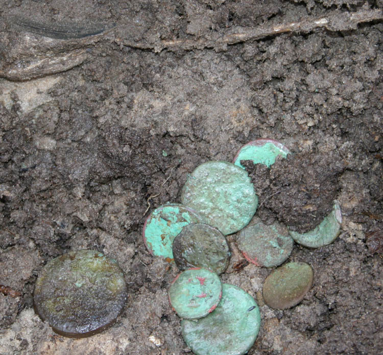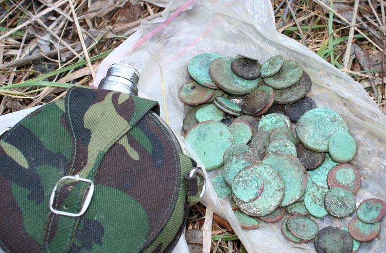 Второй пятак появился незамедлительно из-под той же березы. Третий. Двундель Елизаветинский. Еще. Еще. Еще... Опять пятак.. Словом, обычное дело - распашка на огороде. Один прозванивает, другой копает, третий - любуется.. и так - попеременно, пока не надоест. Да и фляжечка с домашней водочкой ой как кстати оказалась, и речка с ледяной водой - вот она.. Любо-дорого. Фляжка пустеет - кучка растет. На слух со смехом угадывается следующий номинал, собираются поверхностные сигналы.. Кладуха - сборная: от Анны Иоановны до 1760-х конца годов, от денги до пятаков. Больше всего двунделей, но интересных пока вроде нет. Впрочем, мы их особенно не трем и не разглядываем: нам бы собрать все. Ну, не все - так побольше..