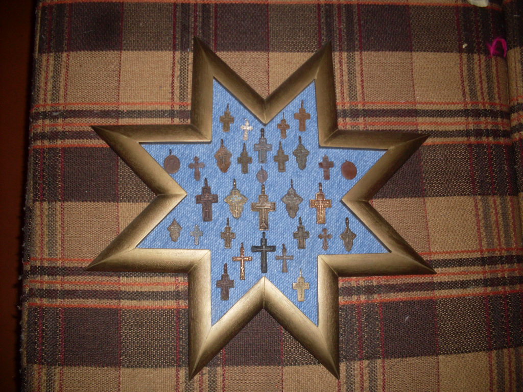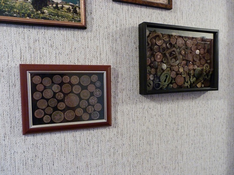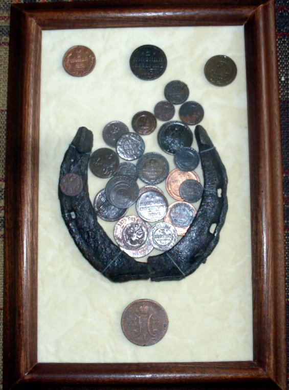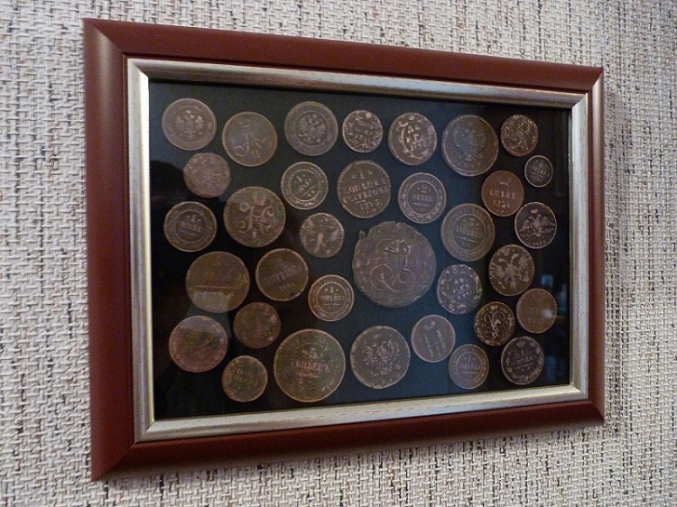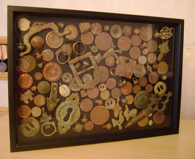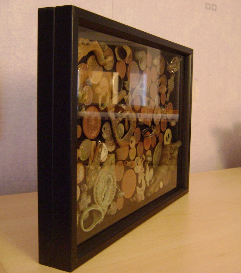 Купил две рамки формата А4, в первой убрал стекло и наклеил суперклеем свои находки (рельеф убитых монеток чуть-чуть поднял мелкой наждачной бумагой). Во второй убрал "дно", закрепил стекло тем же суперклеем и наклеил на первую рамку.