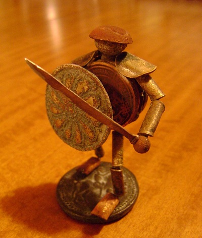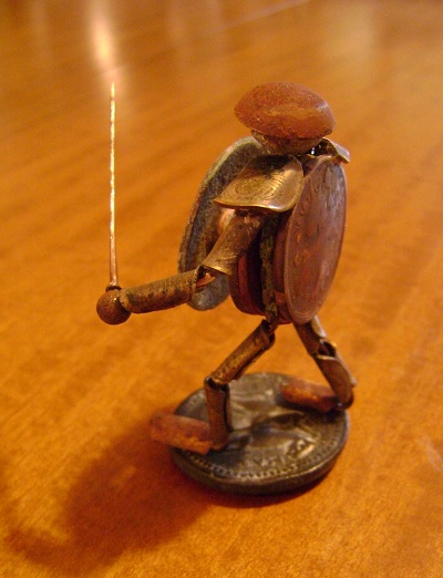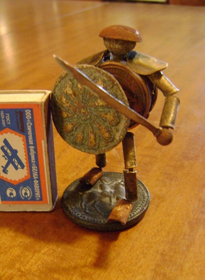 Идея не нова. Каркас из медной проволоки. Латы – одно копеечные монеты СССР согнутые плоскогубцами. Голова – пуговка гирька, каска тоже пуговка, щит – украшение с конской сбруи, "тапки" - гнутые пуговки, "тело" - четыре какалика, меч из медной проволоки, подставка - сувенир из Турции. Всё склеено супер клеем, отдельные элементы травил серной мазью (спрятать царапины от плоскогубцев). Когда собрал воина, то увидел, что получился левша Вложенные эскизы изображений -------------------- - Я интересуюсь знать... ("Ликвидация")