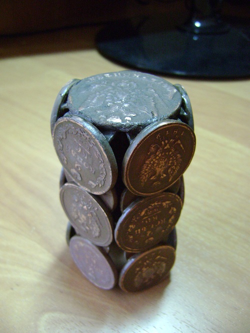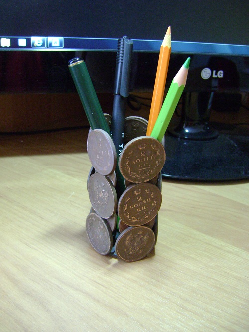 Монеты все "какалики", так что урон нумизматике не нанёс! В качестве дна использовал пятак. Чтобы приклеить боковины согнул пять монеток и приклеил к пятаку. Ну а дальше начал рядами наклеивать двухкопеечники, связывая их между собой другими мелкими монетами. Клей использовал "супер момент". Получилась тяжёлая и устойчивая карандашница. Вложенные эскизы изображений -------------------- - Я интересуюсь знать... ("Ликвидация")
