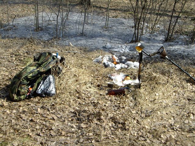 --Авто не пострадало....пешком ходил. Вообще жесть случилась. Впервые за десяток лет поиска такое произошло. Никогда без присмотра не оставлял огонь. Да и в этот раз костёр снегом обложил, ну надеялся на авось получается......урок на всю жизнь.....