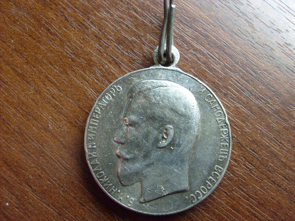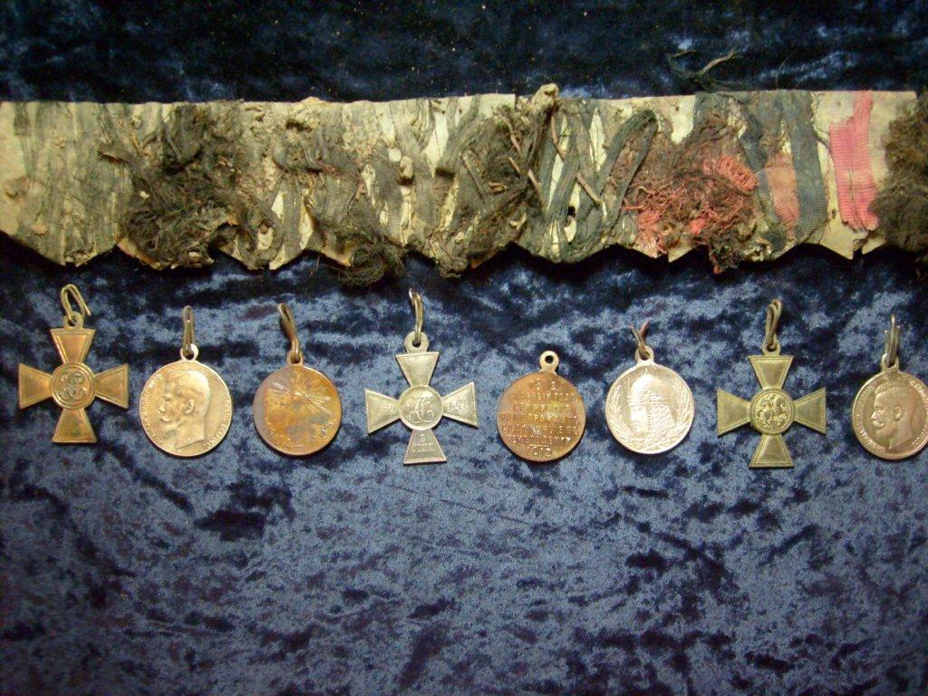 Не все медали с этой колодки. Если первые шесть лент были георгиевскими, то тогда не хватает двух георгиевских наград. Это должны быть либо две георгиевских медали, либо крест желтого металла и медаль. Если седьмая лента - александровско-георгиевская, т.е. от медали за русско-японскую войну, восьмая владимирская - от "усердия" (самая правая?), то какая последняя - непонятно, на 3-х цветную ленту 300-летия Дома Романовых непохожа, а медаль есть. "Медаль" же с головой витязя - вообще не отсюда, это жетон. |