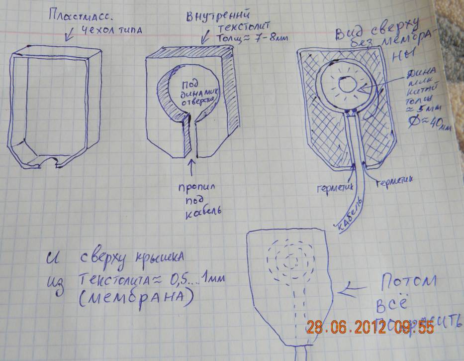 1. "во первых-для того чтобы динамик хоть как то звучал ему необходим обьём воздуха спереди и сзади и возможность перетекания этого воздуха -иначе плёночная мембрана не в состоянии раскачать вакуум" - ПОЛНЕЙШИЙ БРЕД! в наушнике не вакуум, а тот обьем воздуха, который в нем остается при запечатывании, и его более чем достаточно чтоб раскачать большую громкость. 2. "во вторых-пластик глушит звук .и сильно" - пластик - да, тонкий стеклотекстолит - НЕТ, при толщине 0.7-0,8мм - отличная мембрана получается. 3. "в третьих- звук на воздухе и под водой это две разные вещи" - тоже ЕРУНДА, если наушник достаточно громко кричит на воздухе, то при правильной организации передачи усилия звуковой волны (проще говоря герметизации), он так же громко будет кричать и под водой. 4. "поэтому все подводники оснащены пьезо ушами-и них силушки то побольше раскачать воду" - тоже неправда, у некоторых (как правило серьезных) подводных аппаратах именно динамики стоят, они лучше передают звуковой отклик на цель. Теперь, почему не вышло с ГМП. Я тоже вначале ошибочно считал, что для подводы в наушнике нужна побольше воздушная подушка....как в акустической колонке .... и даже сделал такой наушник как лопух с креплением извне на голову.... фигня вышла.....очень и очень тихо пел даже при тонокой мембране...... отрезал его на фиг и выдрал динамик назад. ОЧЕНЬ и ОЧЕНь! сильно влияет на процесс расстояние от мембраны динамика до верхней мембраны самодельного наушника, оно должно быть не более 1...3мм. Никаких воздушных прослоек, минимальный внутренний обьем! чем меньше внутри воздуха - тем громче будет наушник, и внешняя мембрана - не полистирол, а стеклотекстолит и толщина его не более 0.5-0.8мм. Вы можете сказать, что тонковата, порвет давлением - НЕТ, если закреплена (приклеена по кругу) правильно и равномерно - все будет окей, при радиусе динамика всего-то 40мм - не порвет, до 5м - проверено. В доказательство фотка и видео, на фото первый наушник испытавший на себе не менее 30 погружений (краска даже стерлась, ухо покраснело Короче, учитесь делать наушник правильно. Эх, не вышло видео прицепить (места не хватает по обьему данных) но , кто не верит - его проблема. Вложенные эскизы изображений -------------------- Желаю всем здоровья и благополучия!