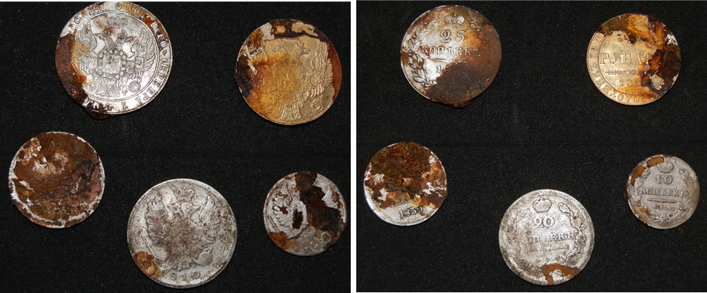На монетах вроде ржавчина, в железной таре лежали. Корнями, может, часть подняло.