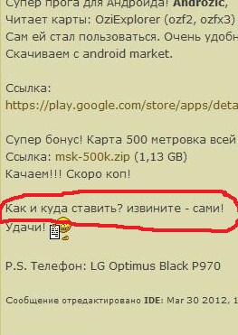 QUOTE(UNL @ Mar 2 2013, 16:58) может лучше Вам попробовать настоящий OziExplorer для Android http://www.reviewdetector.ru/index.php?sho...dpost&p=5608648 Спасибо.Я сначала хотел как и все Ozi,но не получалось его установить в телефон.Повторюсь,компьютер использую только для интернета,все остальное для меня темнота.Но случайно наткнулся на Androzic и он без проблемно установился. QUOTE(igorna @ Mar 2 2013, 19:46) карты хранятся в mnt/sdcard/Androzic/maps вместо mnt/sdcard/ может быть другой путь (в зависимости от аппарата и куда установлена прога), но карты, обычно, хранятся в этой директории. Можешь назначит папку для хранения - меню/настройки/файлы удачи! Плюс уже летит к Вам.Все было именно в mnt.Видно я ее не открывал Хотел попробовать назначить сам папку для хранения-не получилось.Когда захожу в настройки,слово "файлы" не нахожу.(андройд 4) -------------------- напомните,если выиграл.