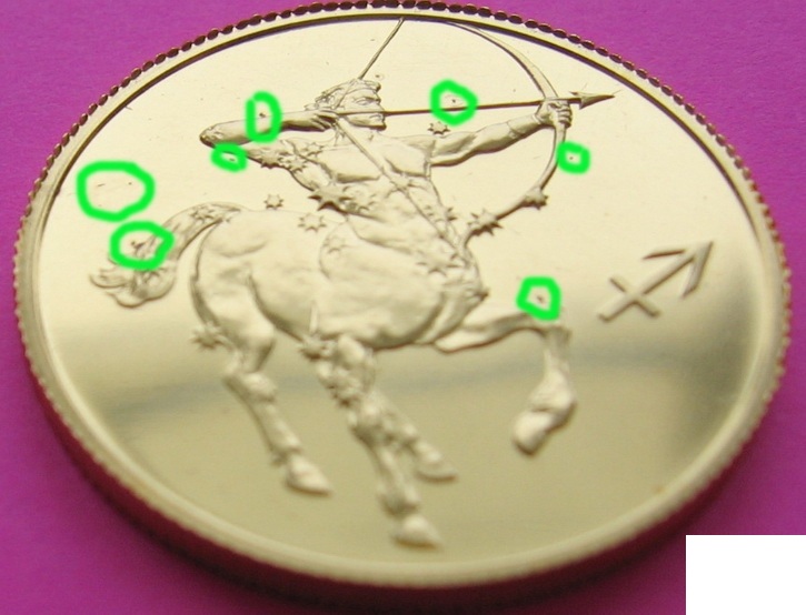 "Настоятельно не рекомендуем прикасаться к монете руками, так как след пальца, оставленный на ее поверхности, практически не поддается удалению. Даже в случае успешной отчистки следа не исключено, что невидимые на первый взгляд жировые остатки вступят в химическую реакцию с составом поверхности монеты и позднее на этом месте появятся пятна окисления" Оксид золота