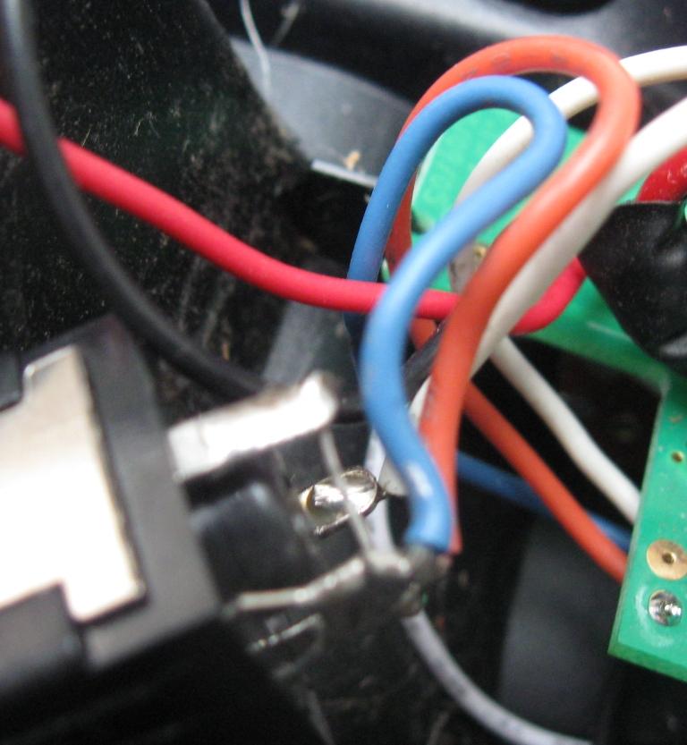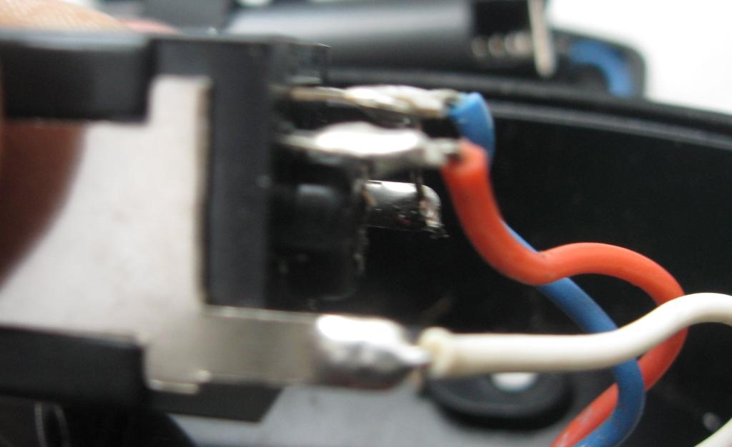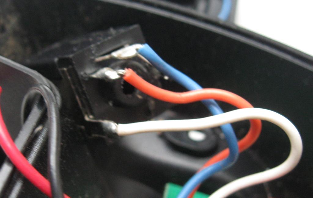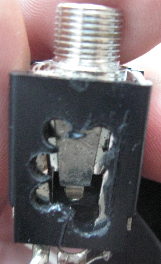 Потом решил, что старому гнезду терять уже нечего и нет причины его не покурочить. Материал прочный, аккуратно вырезать стенку не удалось. Пришлось высверливать. Вышло не очень аккуратно, но внешний вид не являлся первейшей задачей. После высверливания появился доступ к контактам и их можно было гнуть уже не в слепую, как я это делал шилом через дырку для джека. Минут 10 ушло на манипуляции с контактами, в результате которых рабочее положение контактов было восстановлено. Так что пайку пока отложим.