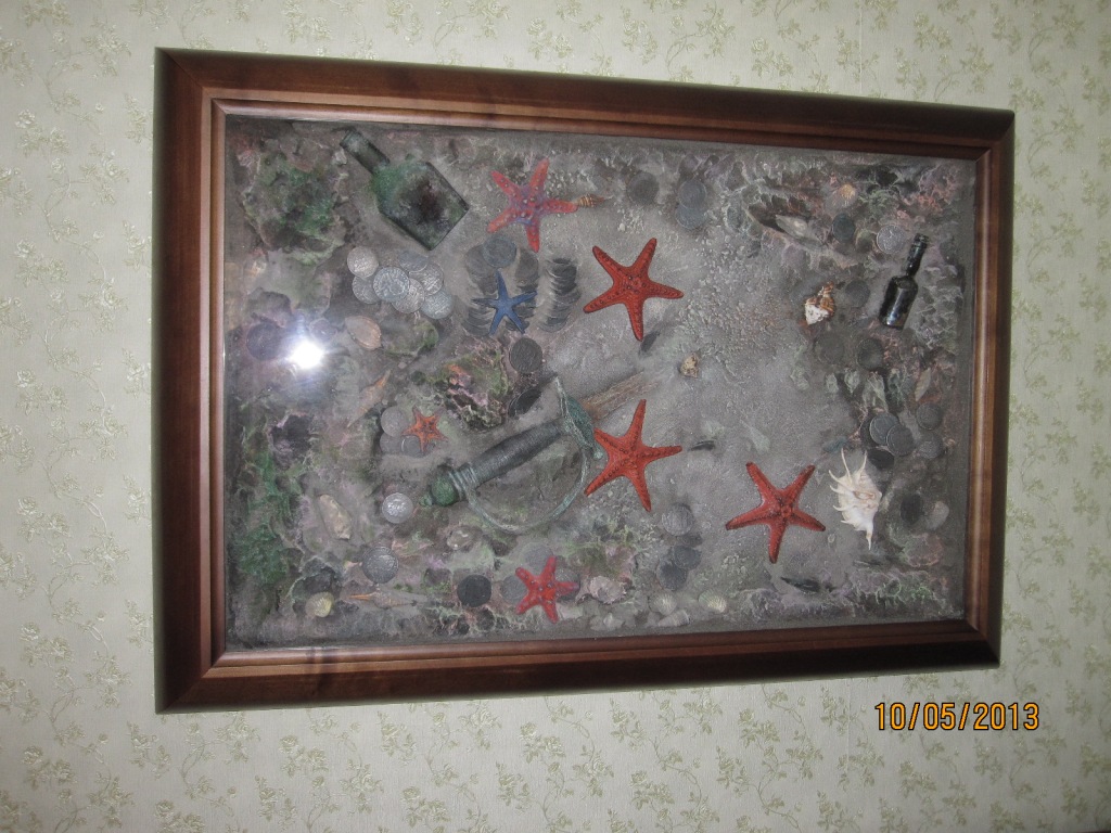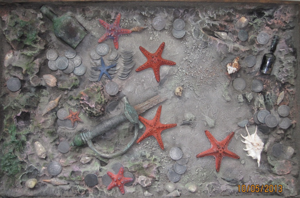 Доброго времени суток, уважаемые форумчане. Решил выставить на Ваш суд инстоляцию на морскую тематику. Долго вынашивал мысль сделать работу на подводную тему, решил сделать с испанскими моретами, на период правления короля Карлоса 3. Как раз на период этого правителя Испании пришлись великие морские открытия, освоения новых территорий (колоний) и постоянных стычек с морскими пиратами. Поэтому, с исторической точки зрения, работа получилась достаточно аутентична.
