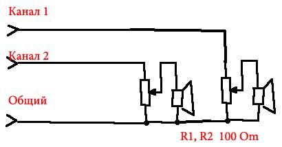 Немного поэкспериментировал. Были вот такие наушники с крепким конструктивом и плохонькими динамиками по 8 Ом и фиговатым частотным диапазоном. Включал их в фишер ф70 до вивисекции, звучат почти так же, как и другие уши, у которых динамики по 64 Ом, только чуть тише. Реакция прибора на то, какое сопротивление наушников включили, целиком зависит от выходного усилителя звукового канал МД. Если в инструкции написано, что включать уши сопротивлением, например, 100 Ом, то значит, что выходное сопротивление звукового услилителя такого прибора не достоточно низкое, что плохо. Незачет конструкторам, т.к. при проектировании усилителей изначально ставится задача добиваться низкого выходного и высокого входного сопротивлений каскадов. У фишера ничего не написано, т. е. можно втыкать любые уши. Просто нужно понимать при этом, что чем выше сопротивление наушников, тем при меньшей "громкости" регулятора достигнется требуемый уровень громкости в ушах. Что есть экономично по питанию. Купил на рынке один динамик подхдящего диаметра сопротивлением 50 Ом, и заменил 8-омный на него. В наушниках были встроеные регуляторы громкости каналов. Фишеру это не нужно, но не выкинул, т.к. планирую юзать не только с ним. В общем, получилось удобно, и достаточно громко. Насчет того, чтобы включать последовательно динамику сопротивление, как в предыдущем посте... ну может там выход усилителя слишком шунтировался, тогда может и так. Но со схемотехнической точки зрения, ток, создающий звуковой сигнал в динамике, через него и резистор будет одинаковм. Но падение напряжения звукового сигнала (а значит и мощность излучения) буде распределяться между резистором и наушником прямо пропорционально их сопротивлениям. То есть это не эффективное решение. Единственный правильный выход в такой ситуации, заменить излучатели на более высокоомные. Если нужно сделать регулировку звука в наушниках по каналом, можно сделать как на рисунке ниже: Номинал переменного резистора довольно свободно можно варьировать, т.к. от большого сопротивлерпя усилителю хуже не бывает, только от низкого. Лучше всего взять резисторы полным сопротивлением 100-200 Ом. И лучше с линейной характеристикой зависимости сопротивления от угла поворота ручки, т.к. тут есть варианты (*аж 3). |