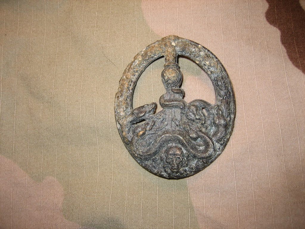 Во первых клеймо, во вторых наплывы от литья на реверсе, в третьих выпученые глаза у черепа, ну и достаточное количество не стыковок(рукоять меча и т.д)