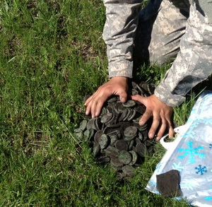 Итак... Поехали мы значит в соседнюю область покопать старые и разведать новые места на два дня с ночевкой. Первый день скажем удался не очень, в основном Менде-Совковые поселения, умершие в 60-80 годы 20 века, накапали полные карманы мусора, за день получилось монеток по 20, но все какалики, в общем-то удачи не было((( На утро рванули на новое место, где раньше была большая ПГМовская деревня, хотя она и сейчас такая же большая, решили походить по берегу и краям огородов - по приезду там оказался лунный ландшафт, оставленный нашими предшественниками, так что ямки приходилось закапывать не только свои, но и чужие. Вижу, ко мне бежит местный - товарищ мой говорит: "ну всё, сейчас орать будет из-за огородов". А нет, очень приветливый парень оказался, с которым мы сразу нашли общий язык, он сам иногда копает и прибор у него тоже был, но он занимается черметом. Он рассказал все места, где тут кто раньше ходил и что находил... И тут начинается самое интересное..... Хотите верьте, хотите нет.... До того, как его не было, попадался только мусор с земли, который наши предшественники оставляли, на местах около ямок, а с его приходом начали попадаться монетки. Он нам посоветовал сходить на один огород в самом конце села, где жила его бабка, и раньше, лет 20 назад, там отец его нашел клад золотых Николаевских монет, из которых половине семьи сделали золотые зубы))). Ну мы конечно же в надежде что-то там до собрать отправились туда. Основательно прочесав весь огород не нашли ни одной монеты, только изрядно мусора и жести. Отправившись на соседние огороды стали находить монетки Лизы и Кати, наш провожатый-местный сказал что ему надо уехать и покормить коров, а позже он вернется. Он уехал и на это всё.... Как отрубило, монеты перестали попадаться((( Через час он вернулся снова, и....... Мой товарищ кричит, что по сигналу у него пятак Лизин, я рядом с ним, копает и чувствует, что попал в монету, в расстоенных чувствах лезет в ямку, достает монету, а она целая, опять сигнал от туда же, лезет, достает ещё два пятака - они тоже целые!!! И все в зелени!!! Опускает катушку в ямку и пошел перегруз!!! Тут всё стало понятно!!! Всё окапали кругом и расшурфили, был снята часть горшка плугом и немного раскиданы монеты сверху около 2-3-х штыков 23 монеты, остальные все были в горшочке. Выкопав все добро, спустились к речке перевели дух от счастья и пересчитали оказалось 320 пятаков Кати и Лизы, местному парню выбрали и подарили самый красивый пятак. И он уехал рассказать отцу о находке. Был полдень. Решили ещё побродить в округе, походили ещё минут 15 пустота, смотрим парень назад к нам возвращается на мотоцикле, только подъехал, а товарища в 4 метрах от места находки первого кубаря устойчивый сигнал, копаем!!!!!!!!!! Целая кубыха!!! Ещё больше 410 пятаков и около 150 мелочи - деньга, полушка, копейка, двушка. Очень хотелось извлечь её целиком в горшке, но так и не получилось, горшок под весом весь рассыпался((( Адреналина и драйва море!!! Пытались все кругом прошурвить поглубже, но находок больше не было((( Местного конечно же отблагодарили по нормальному, вот такой вот рассказ получился, хотите верьте, хотите нет.... Сообщение отредактировано wellness: May 15 2013, 12:01 Вложенные эскизы изображений |