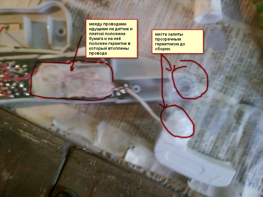 Вырезы готов. Теперь укладываем на плату вырезанный по размеру кусок бумаг и через прорези в нём выводим провода идущие на датчик (делаем всё аккуратно Всё держится на чесном слове) Промазываем бумагу силиконовым авто герметиком и втопливаем в него провода датчика. Так же обильно промазываем части где заделали вырезы и место установки самого датчика (много не мало лишнее уберёте после сборки).