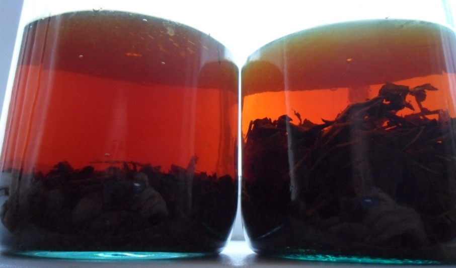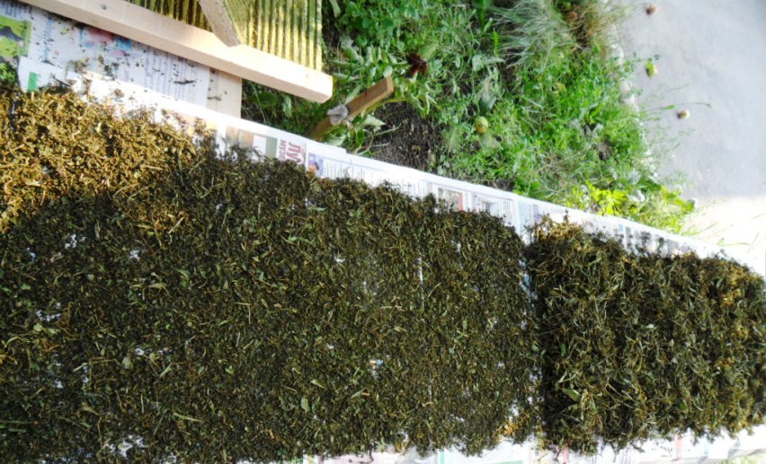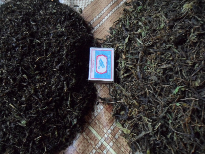 Вот мой результат. Листья перетёр на своей приспособе, без предварительного вяления. Сложил всё в эмалированный тазик, слегка придавил рукой. Закрыл круглым противнем, эмалированным, как крышкой, и оставил на сутки. Ночью стаял в доме, днём на улице в тени, запах получился сильнее чем когда я скручивал в ручную, и масса получилась после ферментации липкой, и влажнее и ароматнее. Далее, решил её предварительно перед сушкой в духовке, подсушить в тенёчке на улице, под яблоней. И вот что получилось. Когда я стал переворачивать, заметил что внизу чуть не половина от массы лежит мелкий лист. Когда уже хорошо подсушилось, я верхние крупные листья отодвинул в сторону. Сушил, в приоткрытой газовой духовке, крупные, и мелкие листья на разных противнях. Прошлую партию до этого способа, похоже я передержал в духовке. Потому что сейчас сравнил вкус, он сильно отличается. Тот который передержал, он немного отдаёт привкусом кофе а этот мягче получился, и приятней. Для образца, взял пол литровые банки, насыпал мелкий и крупный чай, свежий приготовленный, залил горячей водой, и настоял 10 минут. Вкус немного разный получился в этих банках, и сама заварка тоже не много отличалась по запаху. Видимо у крупного чая толстые прожилки, вот и разный вкус, но не плохой. Ну вот и всё, теперь начну выдумывать разные способы приготовления, главное палка каталка теперь у меня есть.